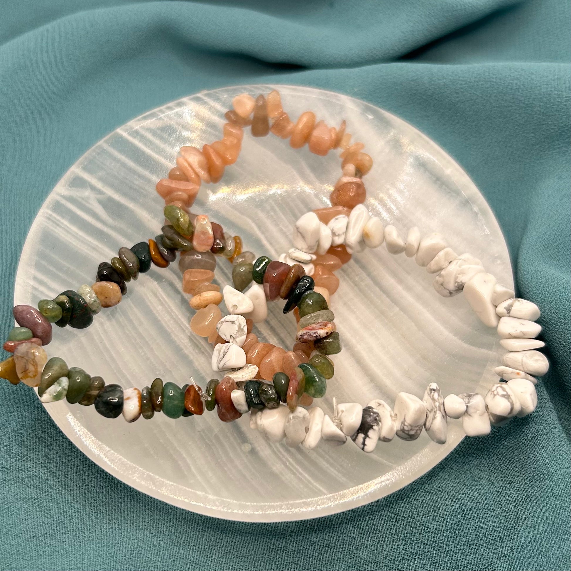 Crystal chip bracelet bundle with various materials. All bracelets are stretchy and adjustable.